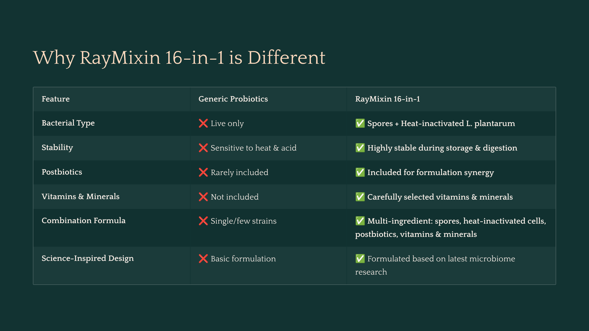 RayMixin 16-in-1 is a premium food supplement expertly formulated to provide essential vitamins, minerals, and beneficial probiotic spores to support your overall health and wellbeing every day.