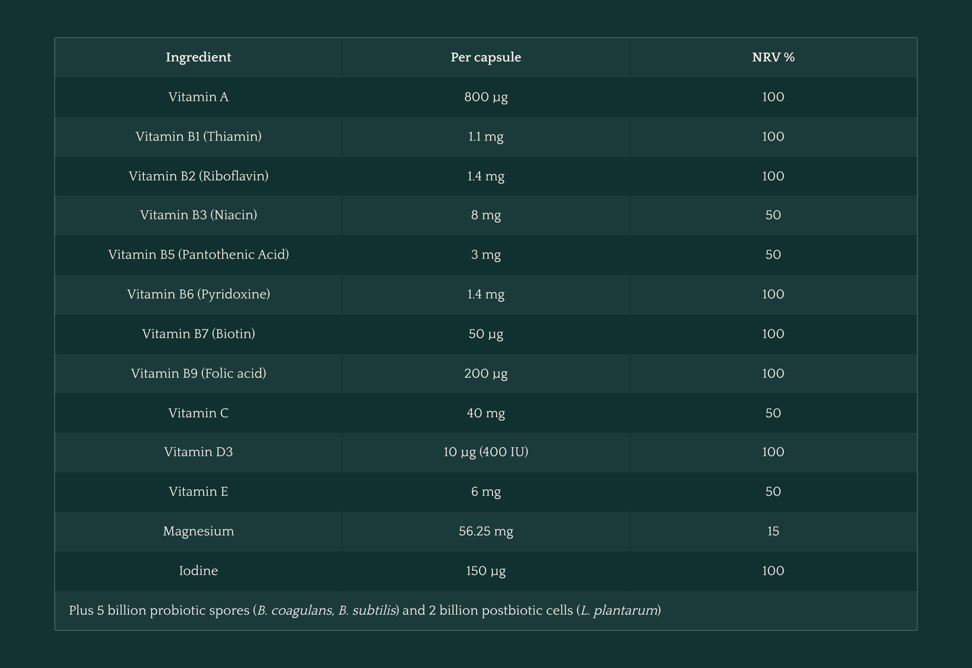 Bacillus coagulans, Bacillus subtilis, Magnesium Citrate, Capsule Shell (Hypromellose), Ascorbic Acid, Potassium Iodide, DL-alpha-tocopherol acetate, Anticaking Agents (Magnesium Stearate, Silicon Dioxide), Naicinamide, Lactobacillus Plantarum, Retinyl Acetate, Maltodextrin, D-Biotin, Calcium Pantothonate, Cholecalciferol (Vegan), Pyridoxine Hydrochloride, Riboflavin, Thiamine Hydrochloride, Folic acid.